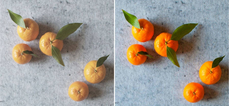 Dalam contoh di atas, saturasi ditingkatkan untuk mencerahkan warna alami buah.